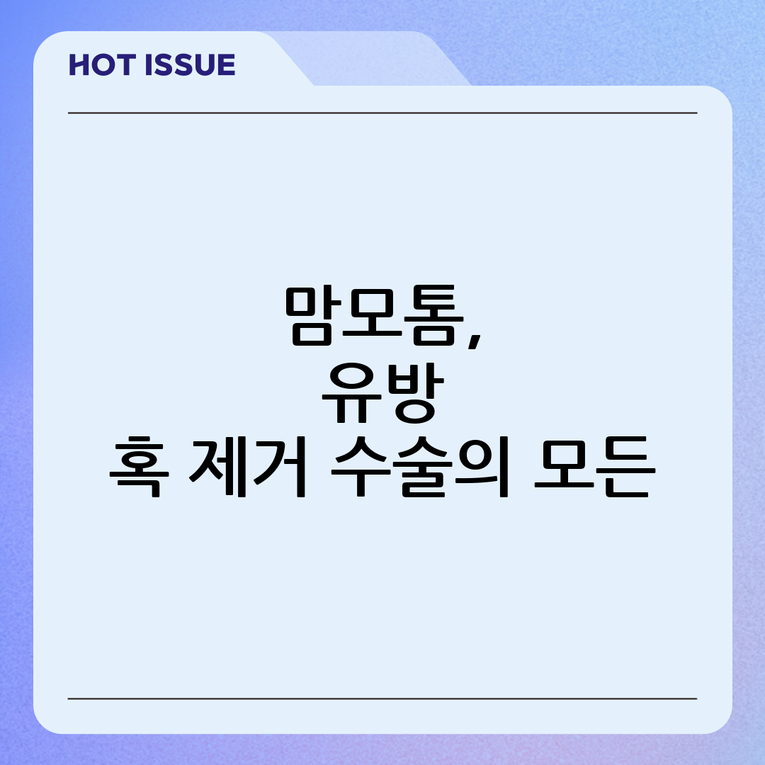 유방에 혹이 만져진다는 것은 많은 여성들에게 불안감을 주는 경험입니다. 하지만 유방에 생기는 혹의 대부분은 양성 종양이며, 맘모톰 수술은 이러한 양성 혹을 효과적으로 제거할 수 있는 안전하고 덜 침습적인 방법입니다 [16, 24]. 이 글에서는 맘모톰 수술에 대한 모든 것을 자세히 알아보고, 맘모톰이 필요한 경우, 수술 과정, 수술 후 관리 및 주의사항, 그리고 자주 묻는 질문들에 대한 답변을 제공하여 여러분의 궁금증을 해소하고자 합니다.